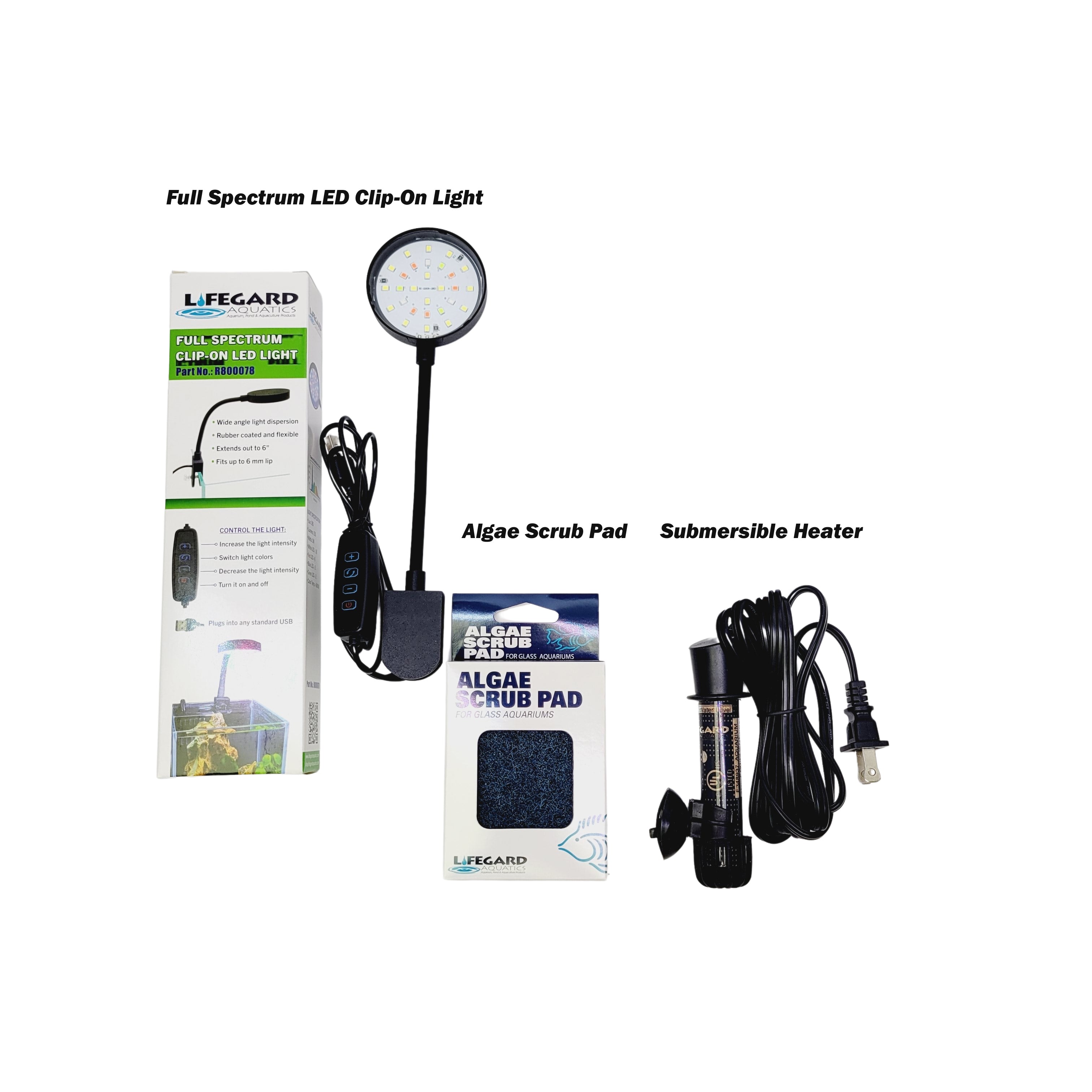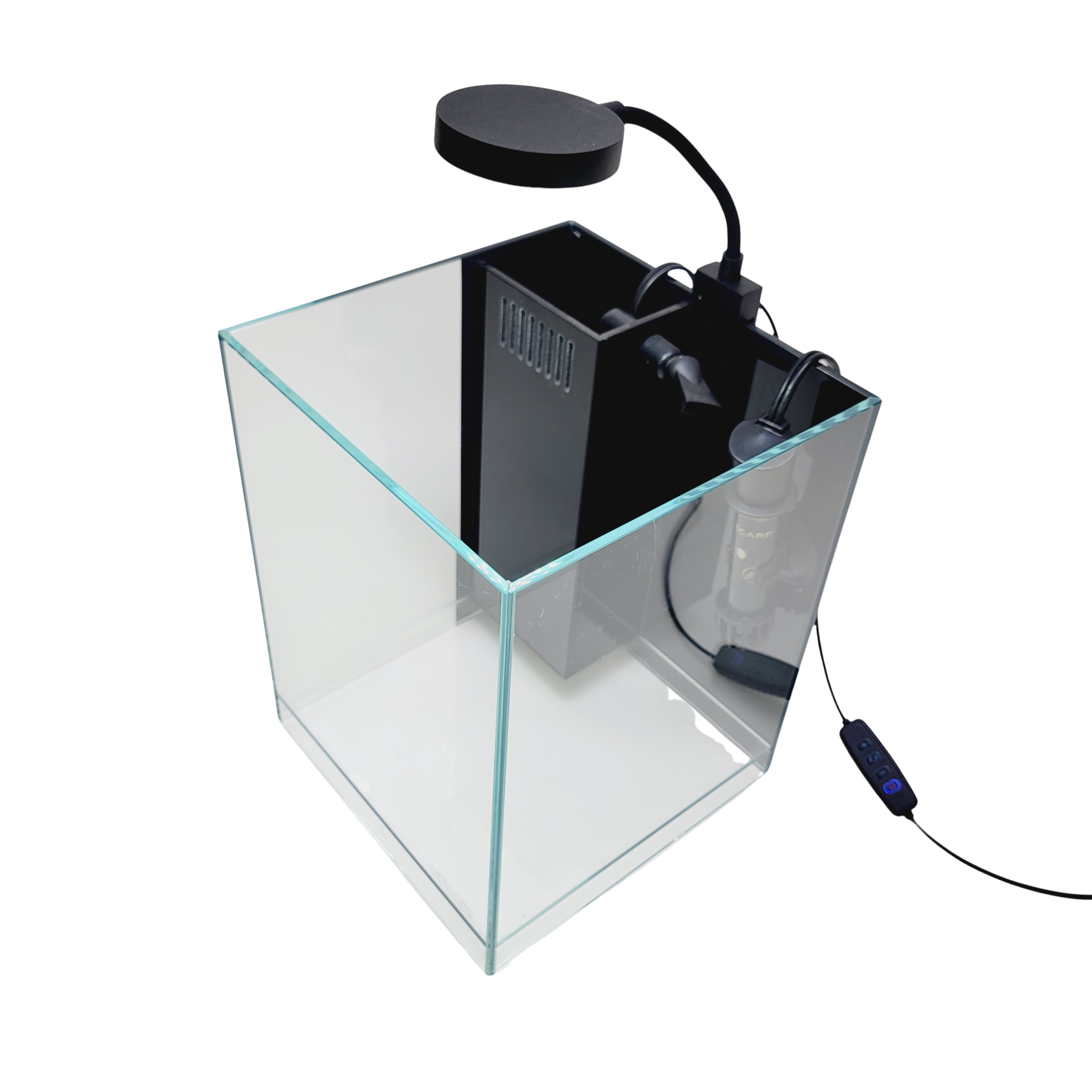 Aquarium includes UL Listed Heater, Full Spectrum LED Light, Algae Pad, Low Iron Ultra Clear Beveled Edge Glass, built-in filter with Quiet One Pump, Mechanical Filter, Multi directional jet and Top Drain.