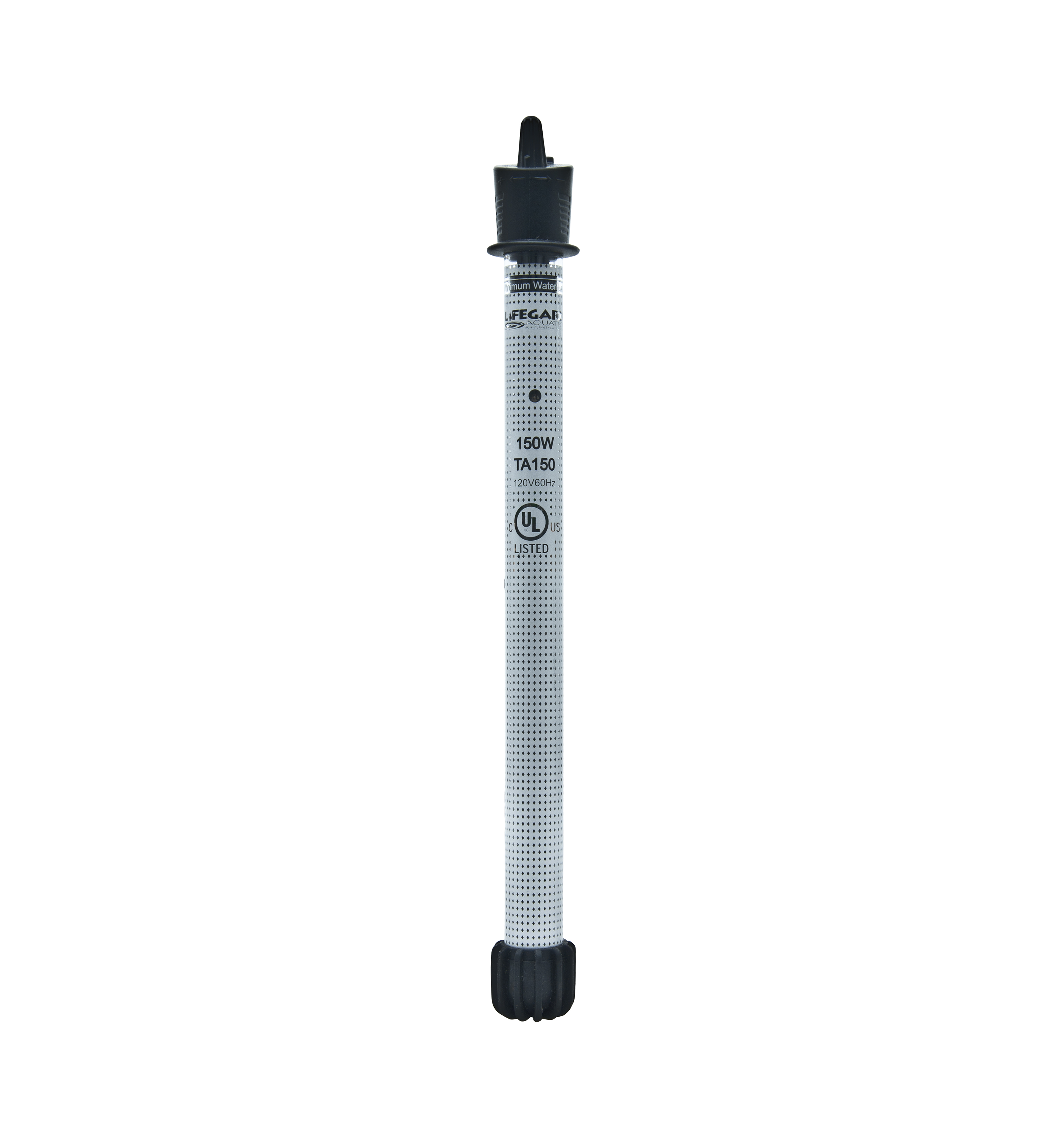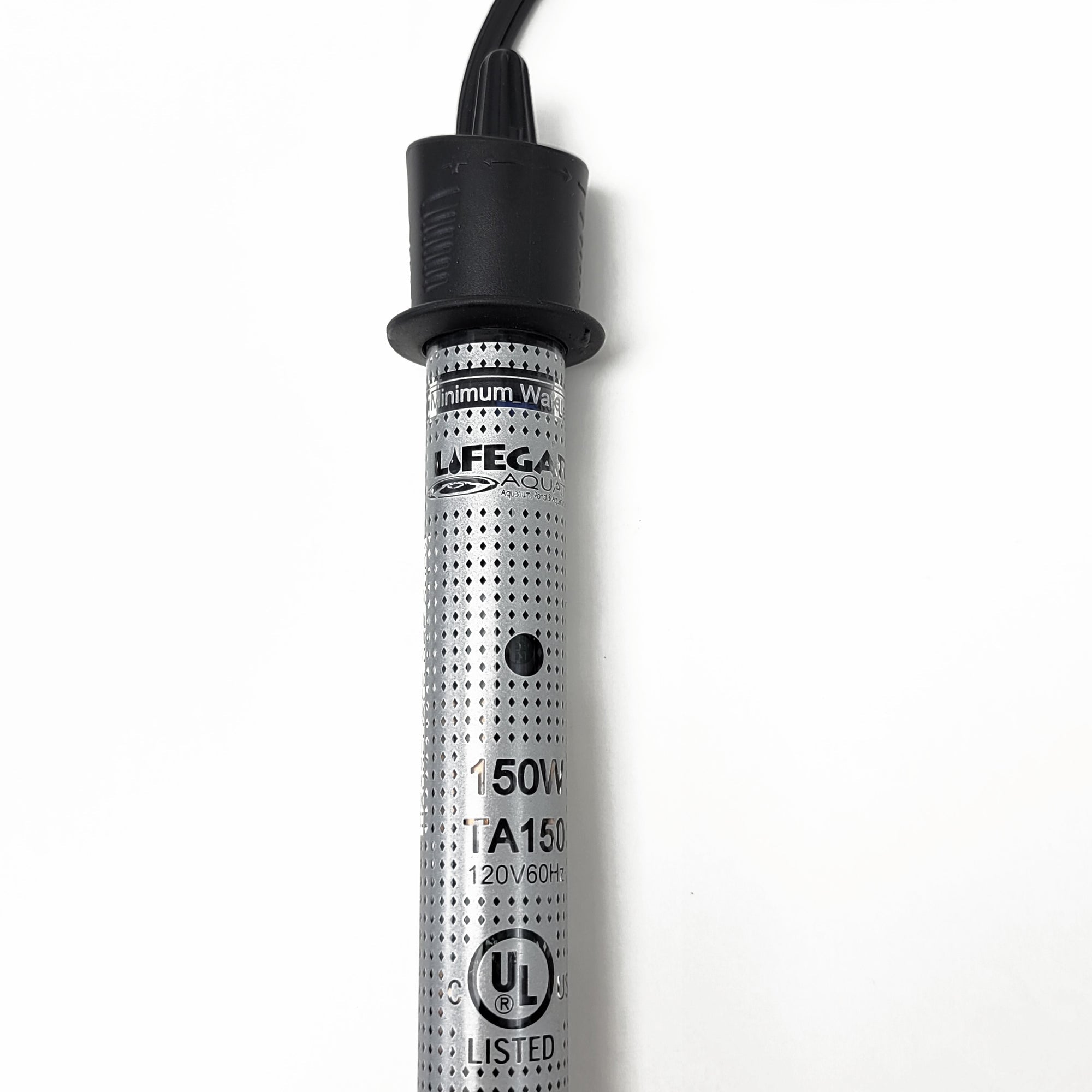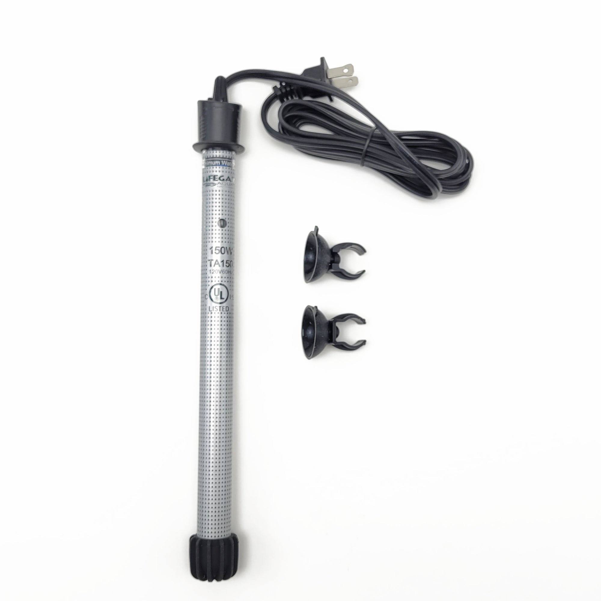Lifegard Aquatics UL Listed 150 Watt Adjustable Quartz Glass Heater Submersible Shatterproof Quartz Heater safe for Freshwater and Saltwater tanks. Easy to set thermostat features LED Power Indicator Light showing operation. 120V/60 Hz energy efficient operation. Quartz Glass tube, 6’ cord and suction cup mounting brackets.
