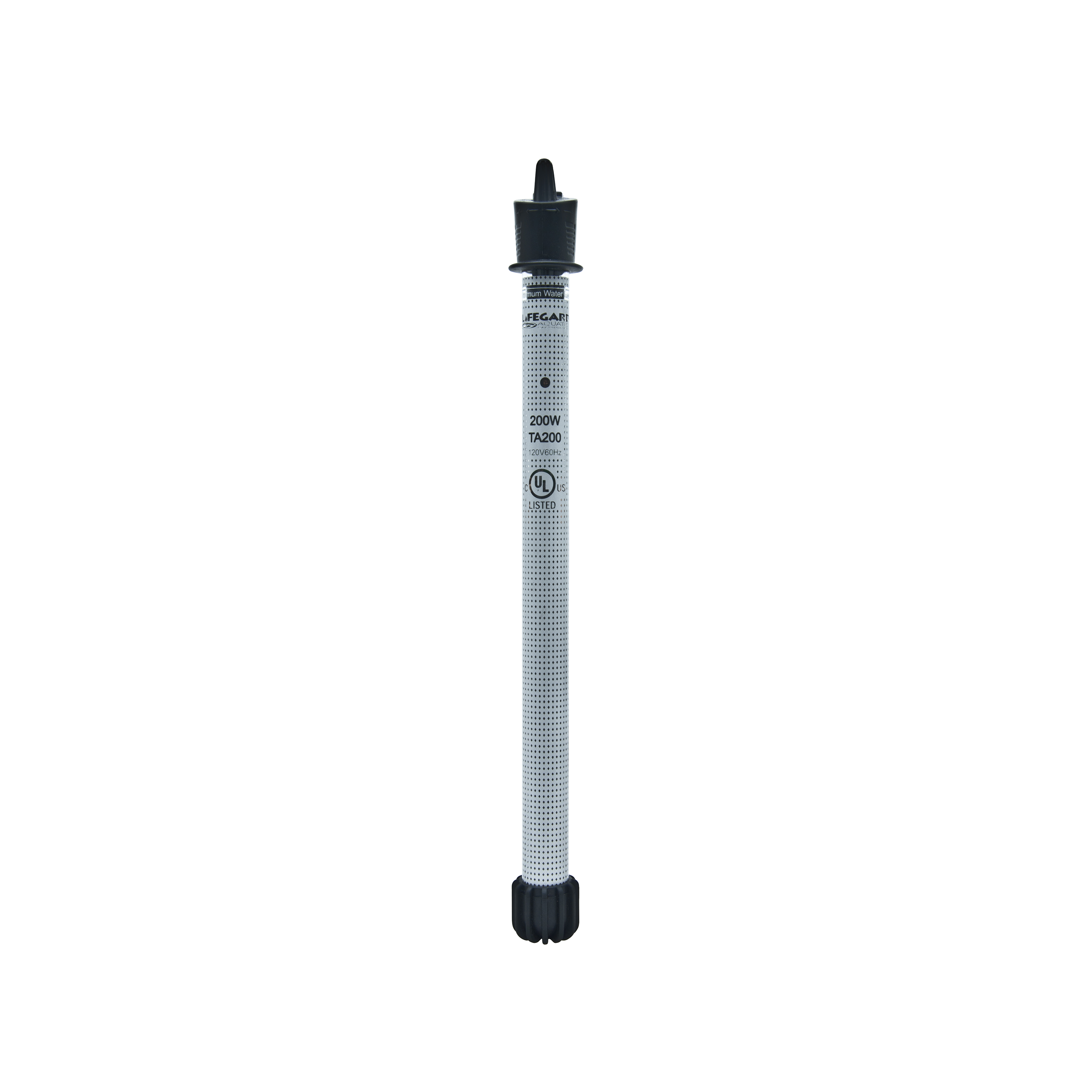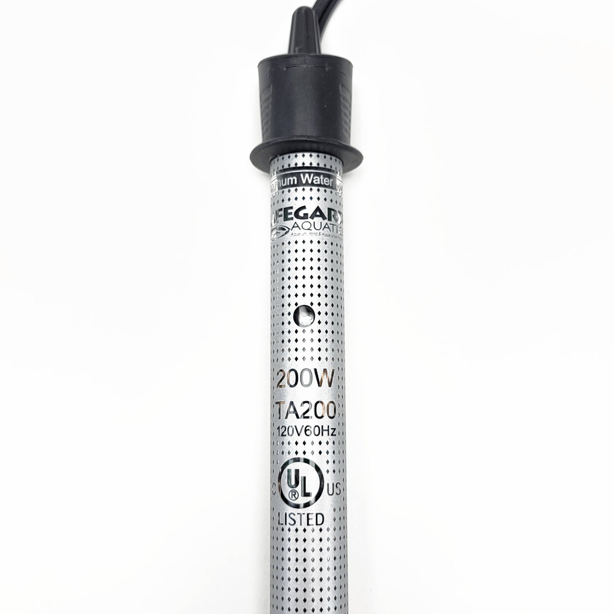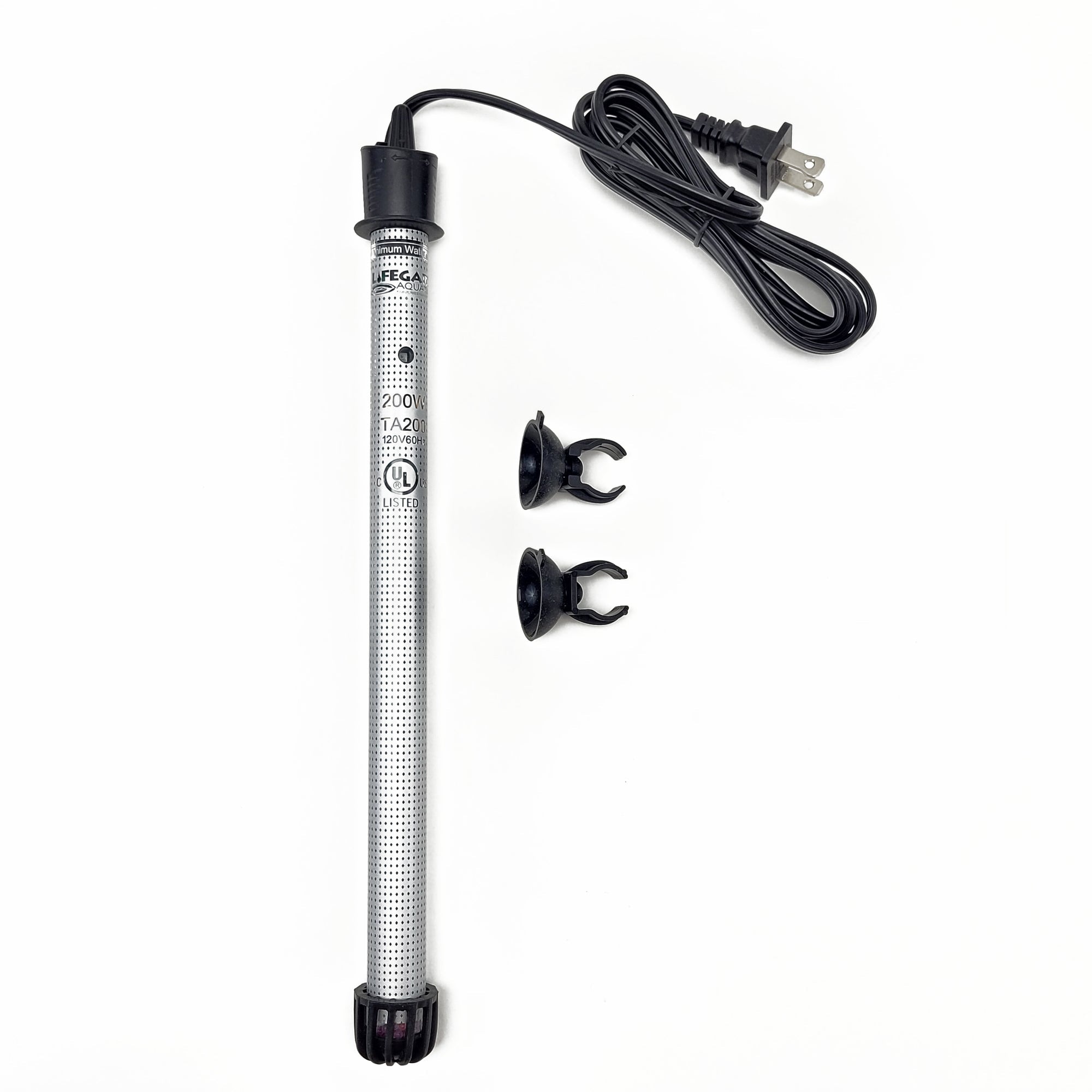 Lifegard Aquatics UL Listed 200 Watt Adjustable Quartz Glass Heater Submersible Shatterproof Quartz Heater safe for Freshwater and Saltwater tanks. Easy to set thermostat features LED Power Indicator Light showing operation. 120V/60 Hz energy efficient operation. Quartz Glass tube, 6’ cord and suction cup mounting brackets.