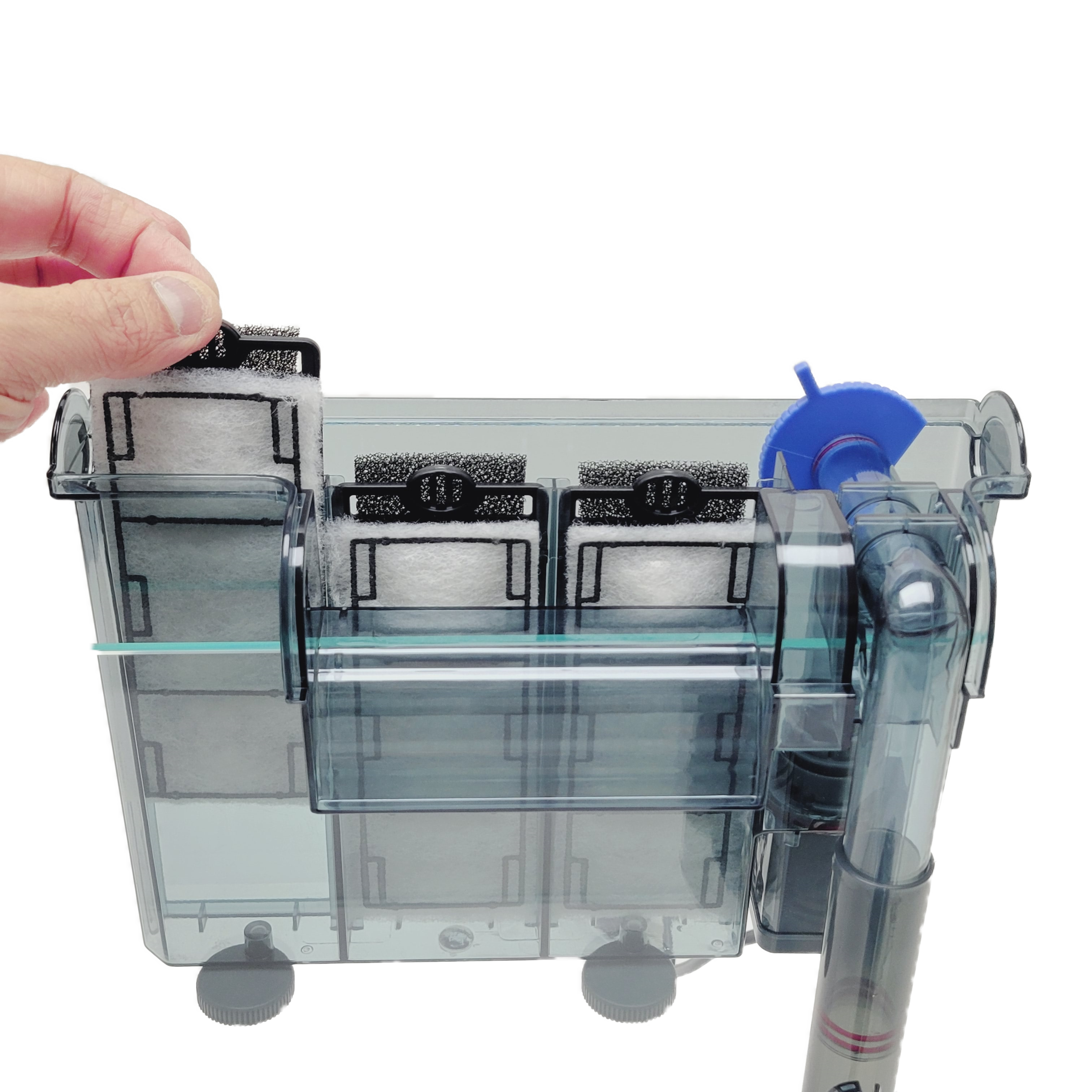 • This hang-on filter is designed to trap large debris at the sponge level that can be removed with periodic cleaning. The activated Carbon removes dangerous toxins and cultivates beneficial bacteria for a healthy environment and finally for fine debris there is a fine Filter pad.