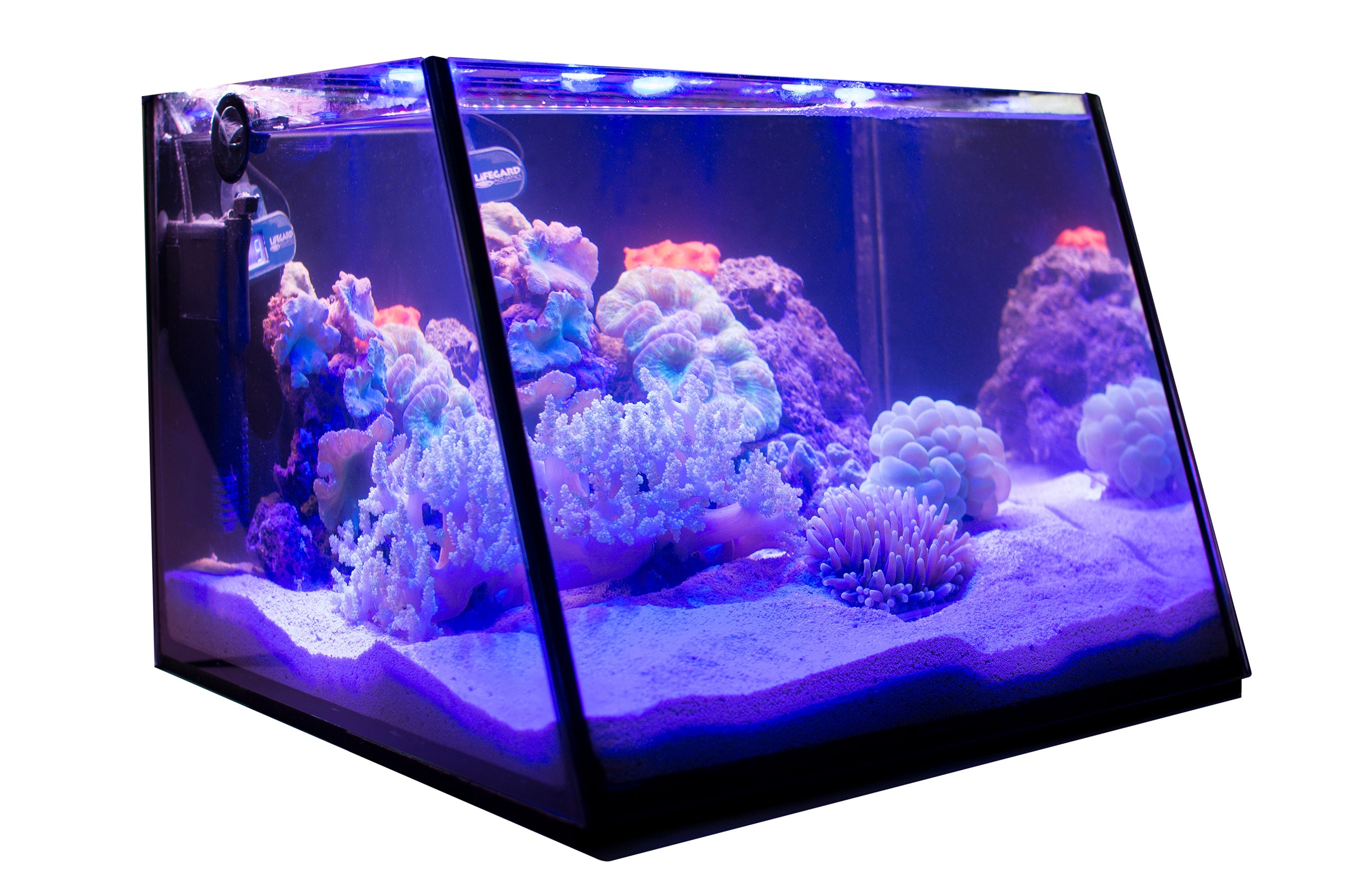 This is not your traditional flat front square or cube tank. This is a well-designed Full View Aquarium. The angled front allows the user to have a larger viewing area inside the tank when placed at the same level with a flat front tank. No more bending down to enjoy the life inside the aquarium. The Full View aquarium offers the Maximum viewing area in its class. This modern designed aquarium comes complete with all the necessary mechanical filtration, carbon filtration, Full Spectrum LED lighting, Quiet One 400 Pump, Water Level control with Waterfall, Aquarium Pad and flex water flow required for a healthy ecosystem and Tempered Glass Lid & Clips.